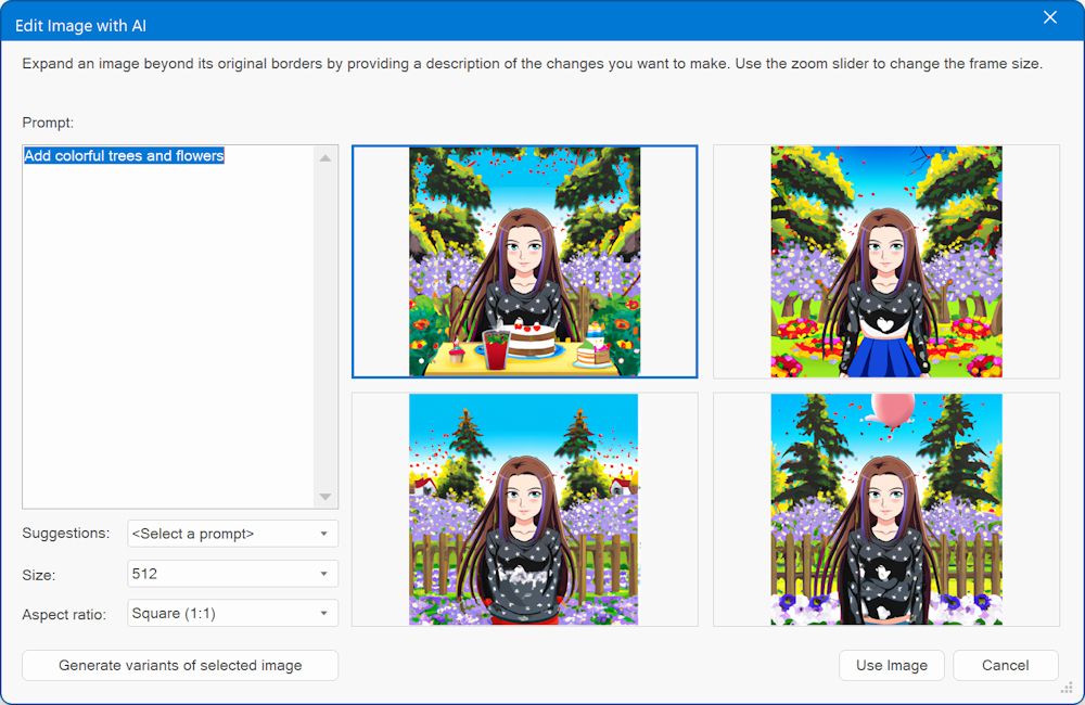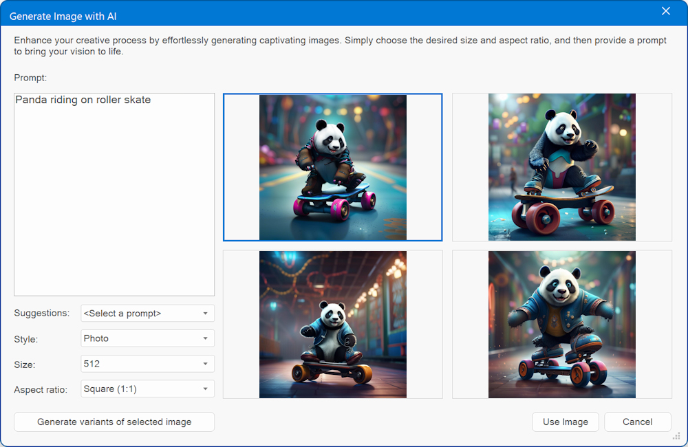 If you're satisfied with the one of the four generated images, you can select that image and the click 'Use Image' button to save it. However, you also create 3 other variants of the selected image by clicking the 'Generate variant of the selected image' button.