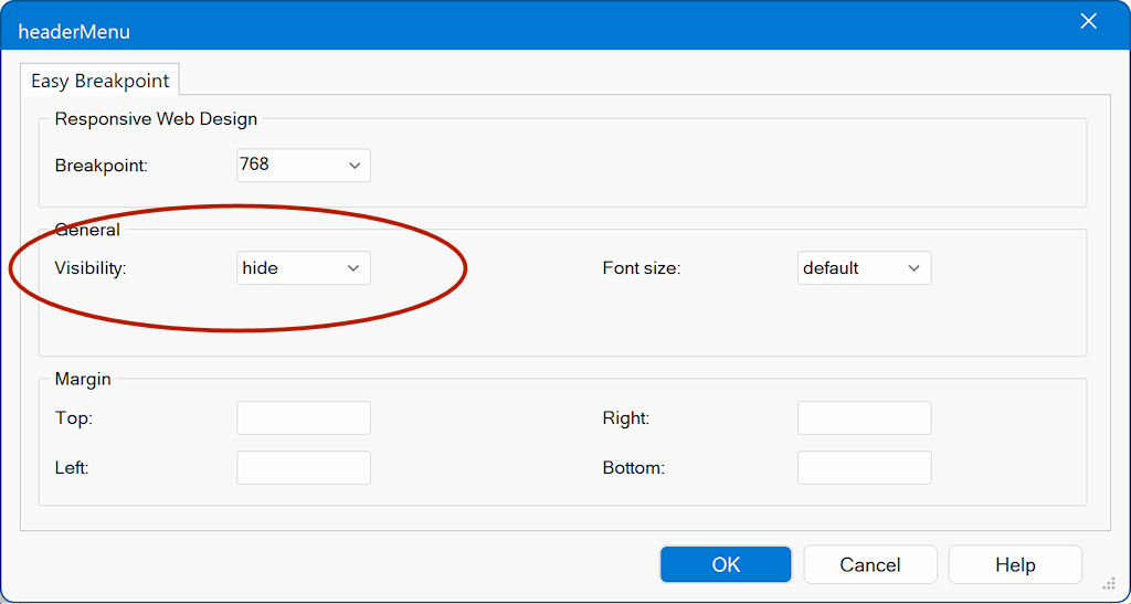 With Easy Breakpoint, most objects now support a simplified, single-breakpoint approach. You can set key responsive properties—such as visibility, font size, margins, padding, and alignment—specifically for that object, without creating additional full breakpoints.