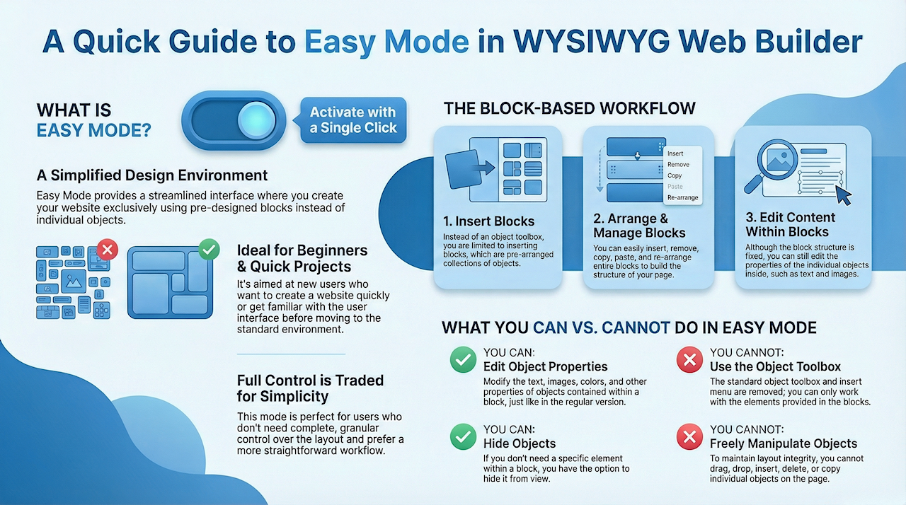 Easy Mode offers a simplified environment for quickly building websites using Blocks, ideal for new users or those who prefer a streamlined experience. In this mode, you'll work with pre-designed blocks instead of individual objects, making it easy to create layouts without needing full control over every element. While you can edit object properties and manage blocks, actions like dragging, inserting, or deleting individual objects are restricted to maintain layout integrity.