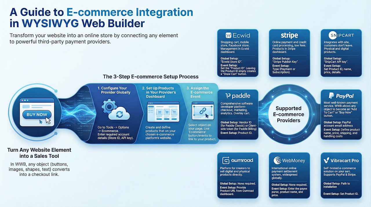 WYSIWYG Web Builder has built-in support for several third party shopping cart checkouts and/or payment providers: