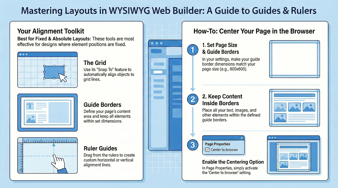 When designing a web page, it can be helpful to enable guide borders, rulers, or a grid to assist with alignment and spacing.