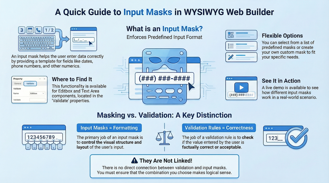An input mask helps the user with the input by ensuring a predefined format. This can be useful for dates, numerics, phone numbers etc. Input mask functionality is available for the editbox and text area in the 'Validate' properties.