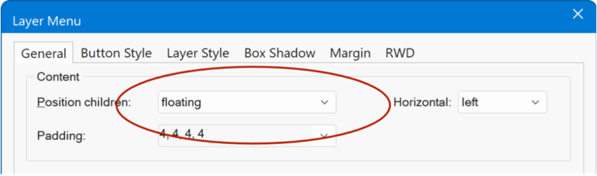 Setting Position children to Floating enables responsive, flexible content within menu layers. This mode supports padding, alignment options, and the use of layout grids. With a layout grid, you can easily build clean, structured multi-column designs that adapt to different screen sizes.