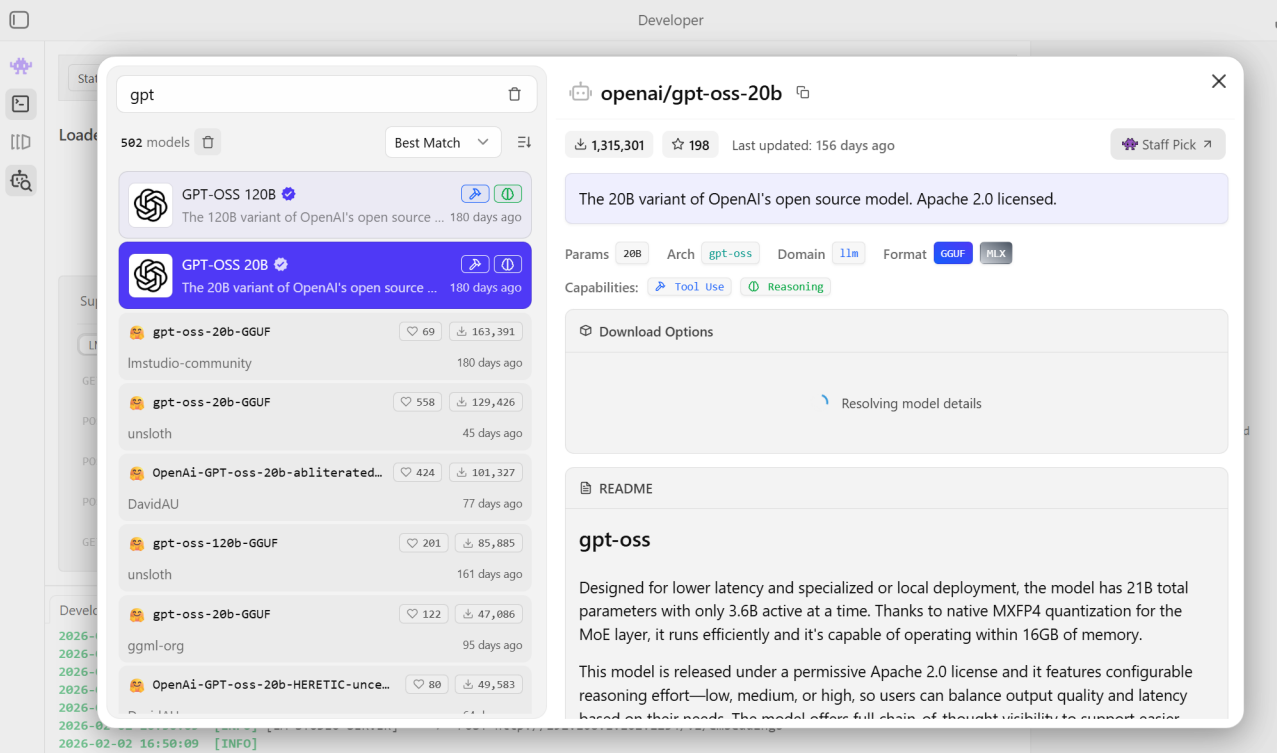 LM Studio provides built-in model management, making it easy to choose and install models directly from the application.