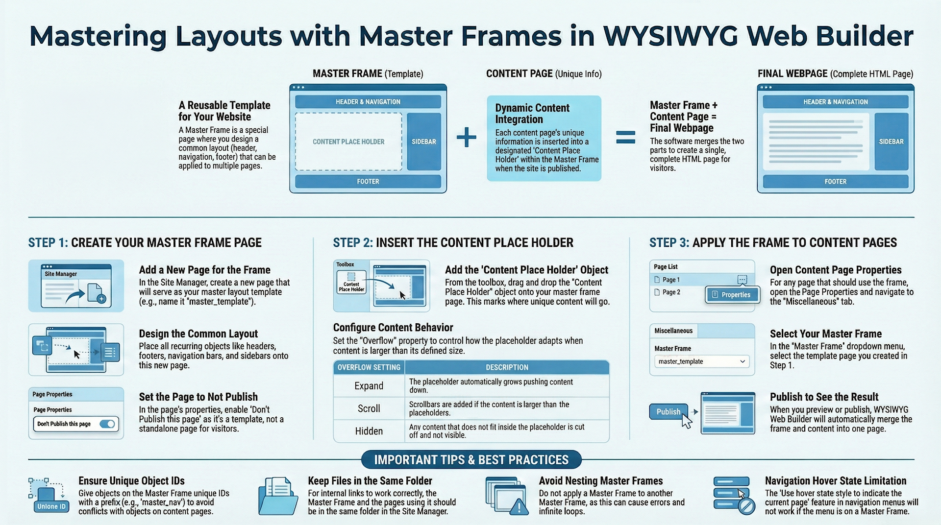 A master frame can be used if the frame (header/footer) of a website needs to be the same for the whole website, while the content is different for each page. The master frame (which is just another page) will merge with the objects during publishing. The result will be one HTML page.