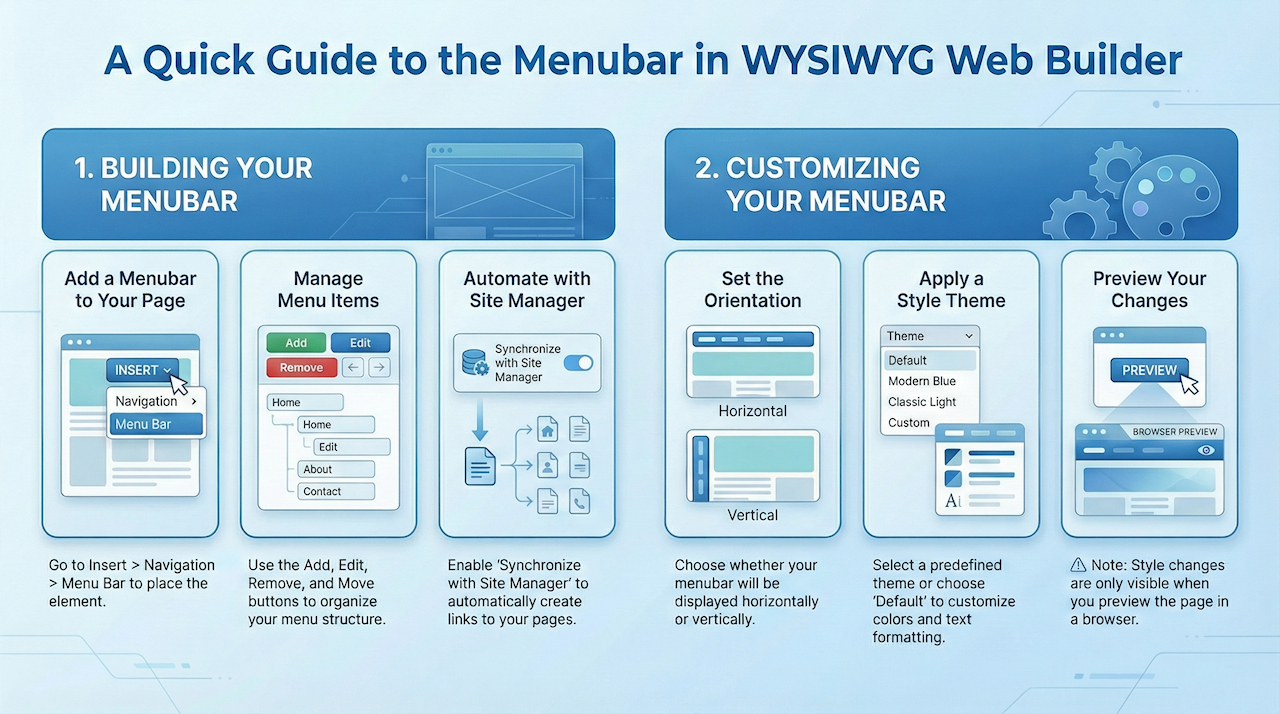 One of the exciting features of WYSIWYG Web Builder is the ability to add advanced navigation elements to your web page with only a few mouse clicks. The Menu Bar is one of those elements. To insert a Menu Bar select Insert->Navigation->Menu Bar.