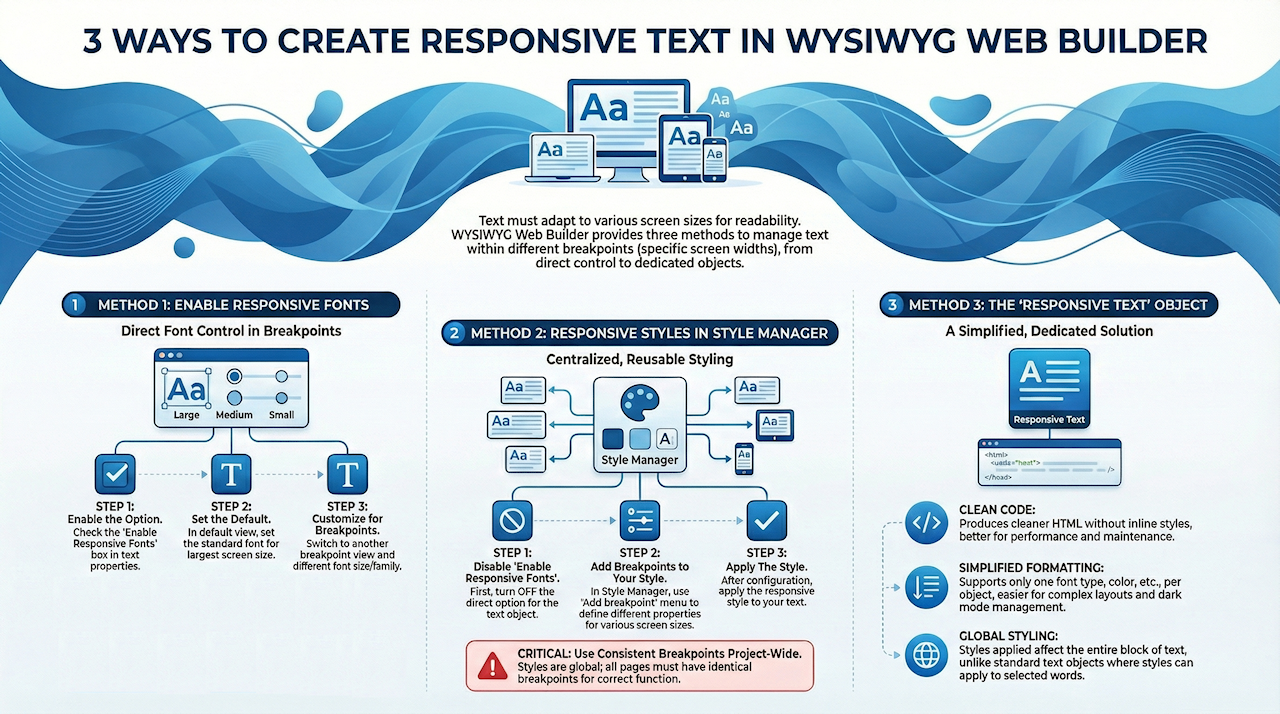 In WYSIWYG Web Builder, there are 3 ways to make the text object responsive: