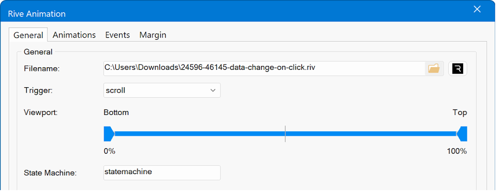 • scroll, animation is played when the object scroll into view. The viewport range slider can be used to specify the exact position.