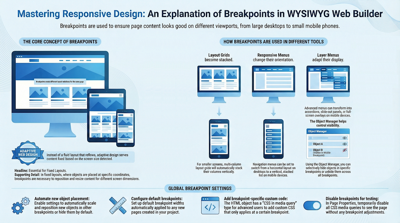 The great thing about Responsive Web Design in WYSIWYG Web Builder is that you have full control over the layout in different breakpoints unlike in other tools where you are force to use predefined layouts/templates.