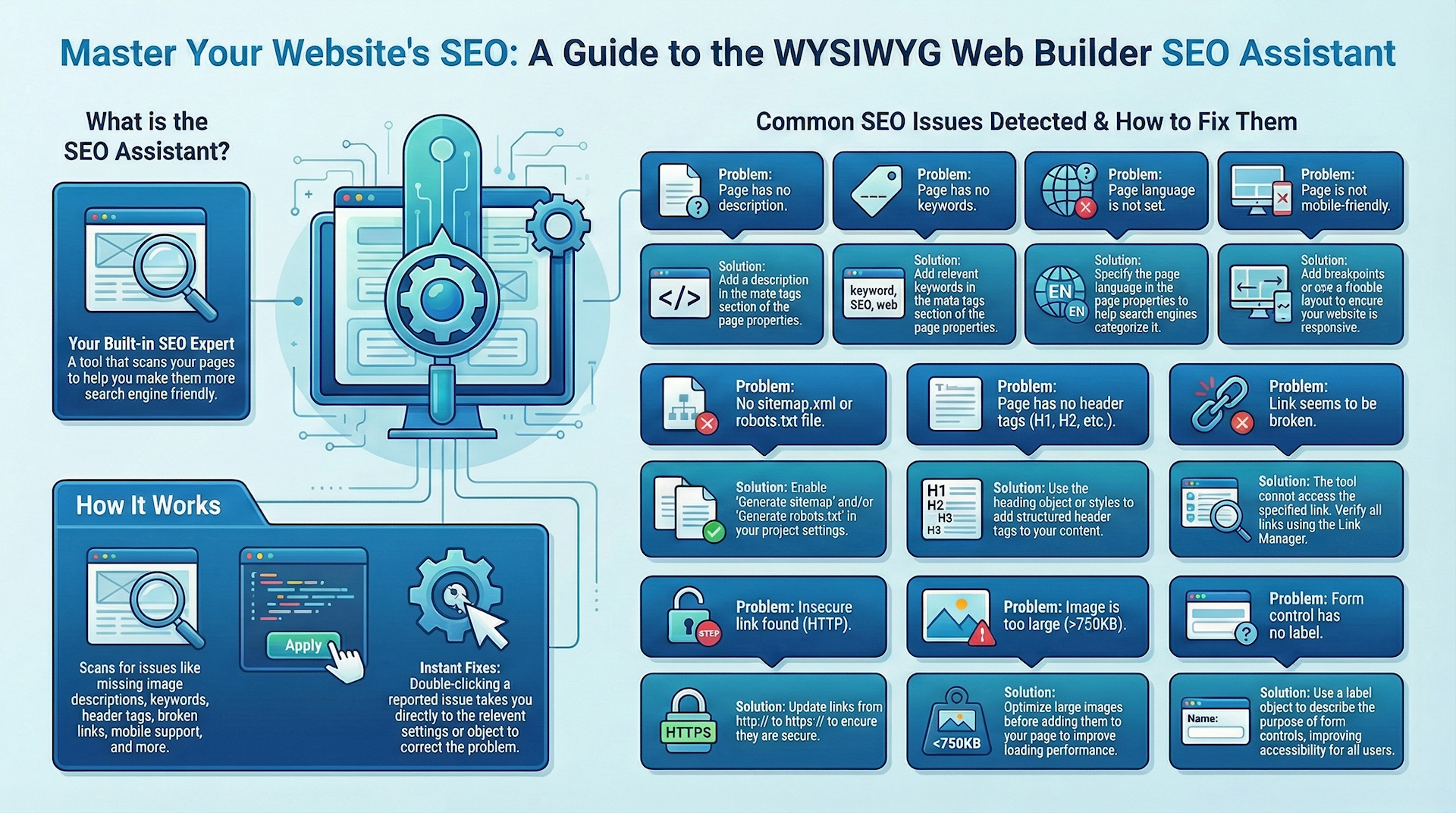 The SEO Assistant scans the page for missing image descriptions, keywords, sitemap.xml/robot.txt, header tags, broken links, mobile support and more. Double clicking one of the reported issues will either open the properties (meta tags, sitemap etc.) so you can fix the issue or select the object in the workspace. The SEO Assistant window is a 'modeless' window, which means that you do not have to close it to continue working on your website.