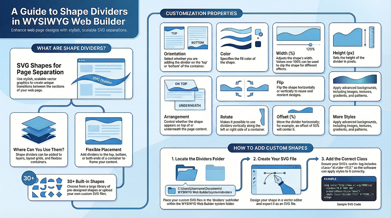 Shape dividers are SVG based shapes that can be used to separate the sections of a page. Shape divider are available in layers, layout grids and the flex box container. The dividers can be added at the top or bottom (or both) of a layer.