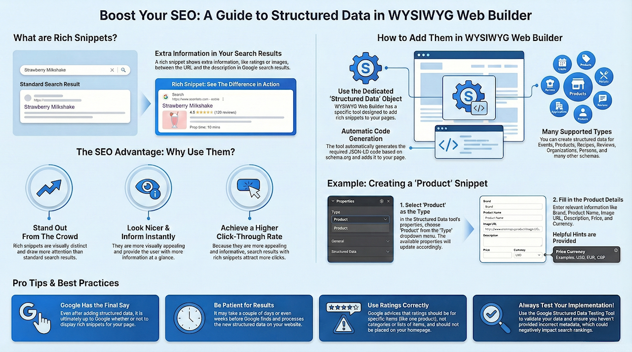 WYSIWYG Web Builder has a dedicated object to add rich snippets to your pages: Structured Data.