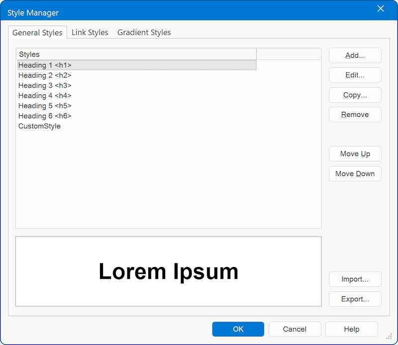 By default, the Style Manager includes 6 standard headings <h1> … <h6>, but you can also define your own heading styles: