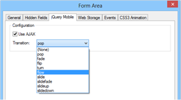 - New feature: Transition (mobile pages only). Specifies the page transition. Page transitions only work when AJAX is enabled.