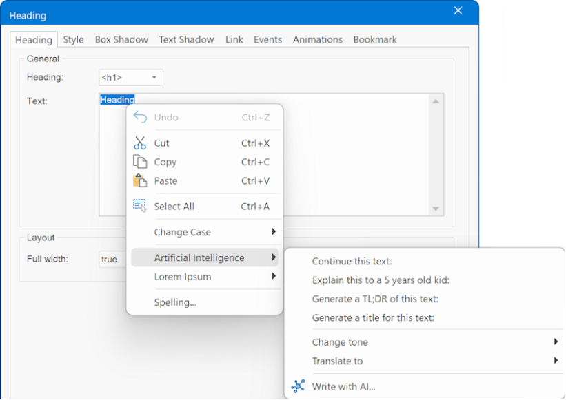 For standard text, you can use the Artificial Intelligence button on the Ribbon to open the "Generate Text with AI" dialog. However, this functionality is available for almost all text input fields within WYSIWYG Web Builder via the context menu!