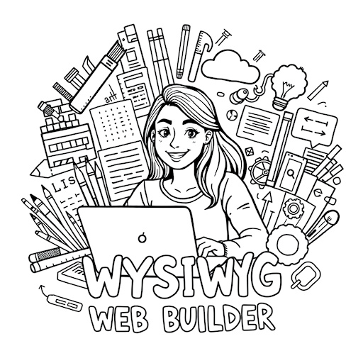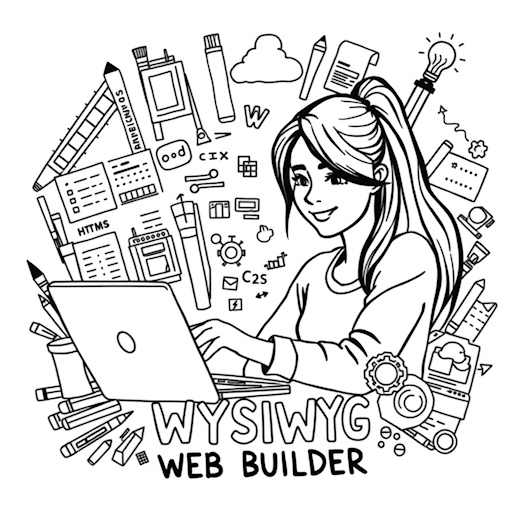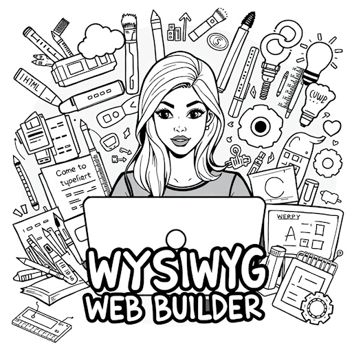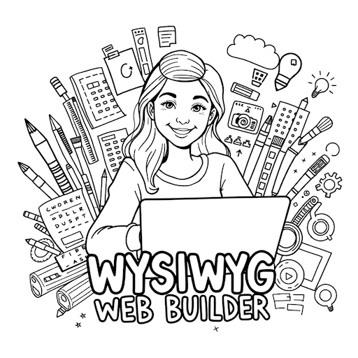 Black and white line art, a detailed and artistic doodle-style logo for 'WYSIWYG WEB BUILDER'. The logo features a young woman, sitting at a desk and working on a laptop. Surrounding her are various web design and development tools: brushes, pencils, rulers, color palette swatches, HTML/CSS code snippets, typography samples, grid lines, layout blocks, a mouse pointer, a cloud icon, a magnifying glass, a gear icon, folder or file icons, responsive design screens (mobile, tablet, desktop), undo/redo arrows, a light bulb representing creativity, and wireframe sketches.