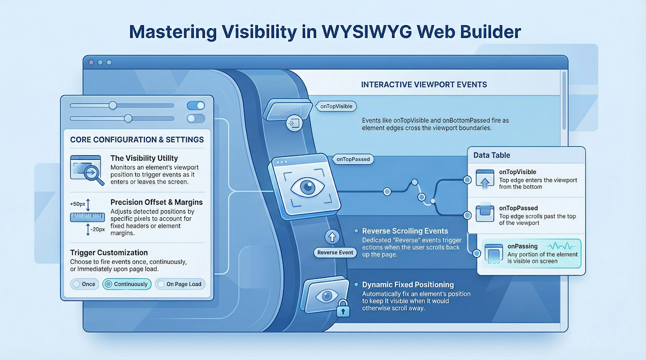 Visibility is a utility for monitoring an element’s position within the viewport. The Visibility object provides a set of events that make it easy to trigger actions based on how an element enters or leaves the visible area of the screen.