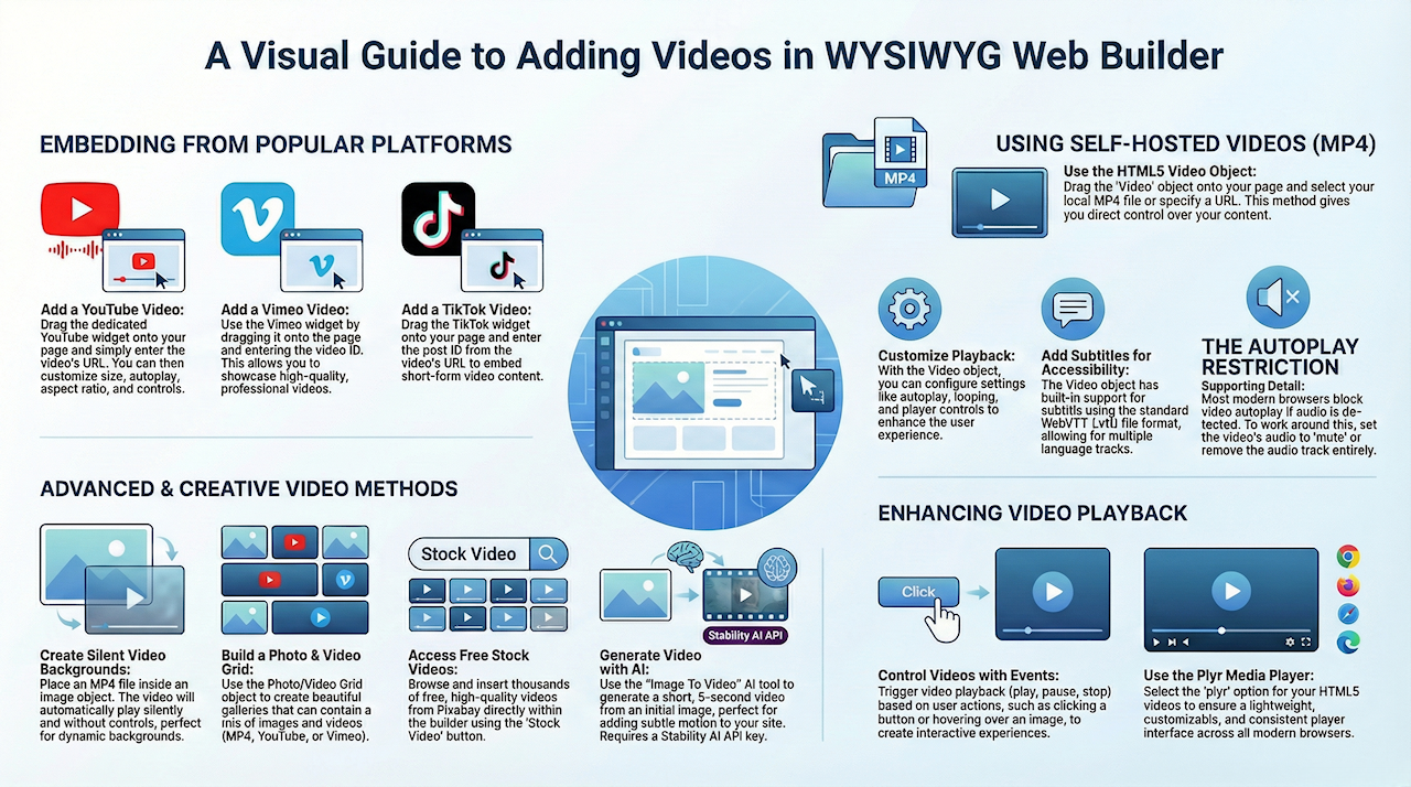 In WYSIWYG Web Builder, there are several ways to add videos to your web pages. You can embed videos from popular platforms like YouTube and Vimeo, or upload and play self-hosted video files in formats such as MP4.