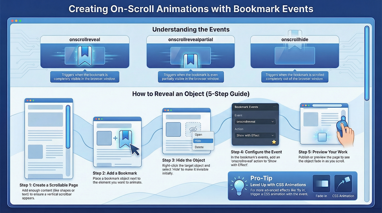 This tutorial explains how reveal objects on scrolling by using bookmark events. The bookmark object supports 3 events that make it possible to trigger actions based on the scroll position of the page:
