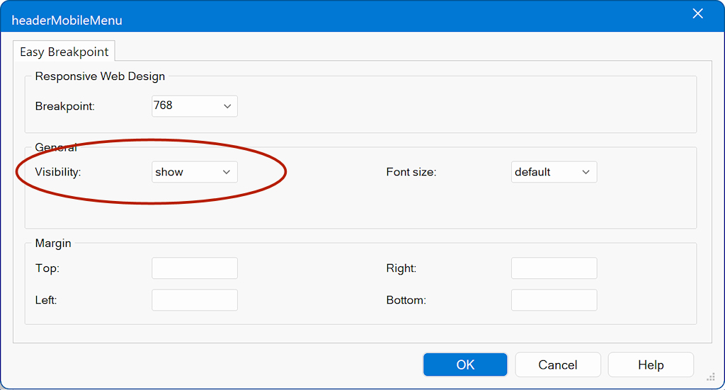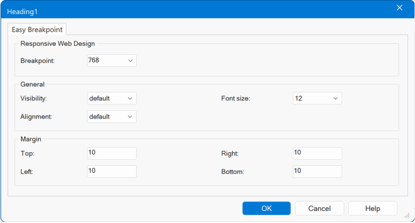With Easy Breakpoint, most objects now support a simplified, single-breakpoint approach. You can set key responsive properties—such as visibility, font size, margins, padding, and alignment—specifically for that object, without creating additional full breakpoints.