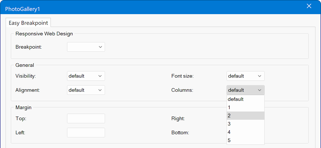 There are also a few special options available for certain objects. For example, in the Photo Gallery you can set a different number of columns for the selected breakpoint.