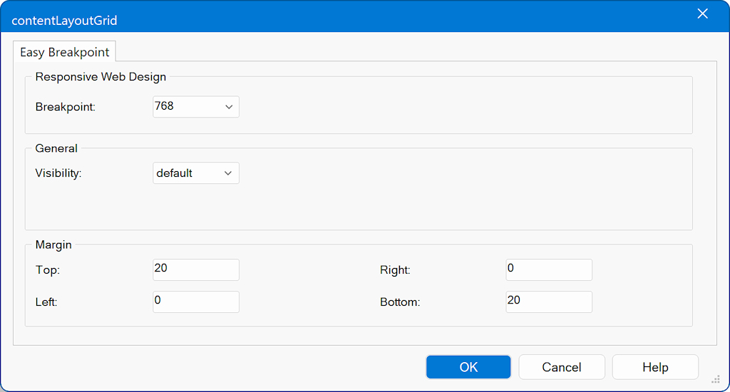 Often, you may want to add extra spacing between objects on smaller screens. The margin properties let you adjust the left, top, right, and bottom margins specifically for the breakpoint. If you leave all values empty, the default (desktop) margins will be used.