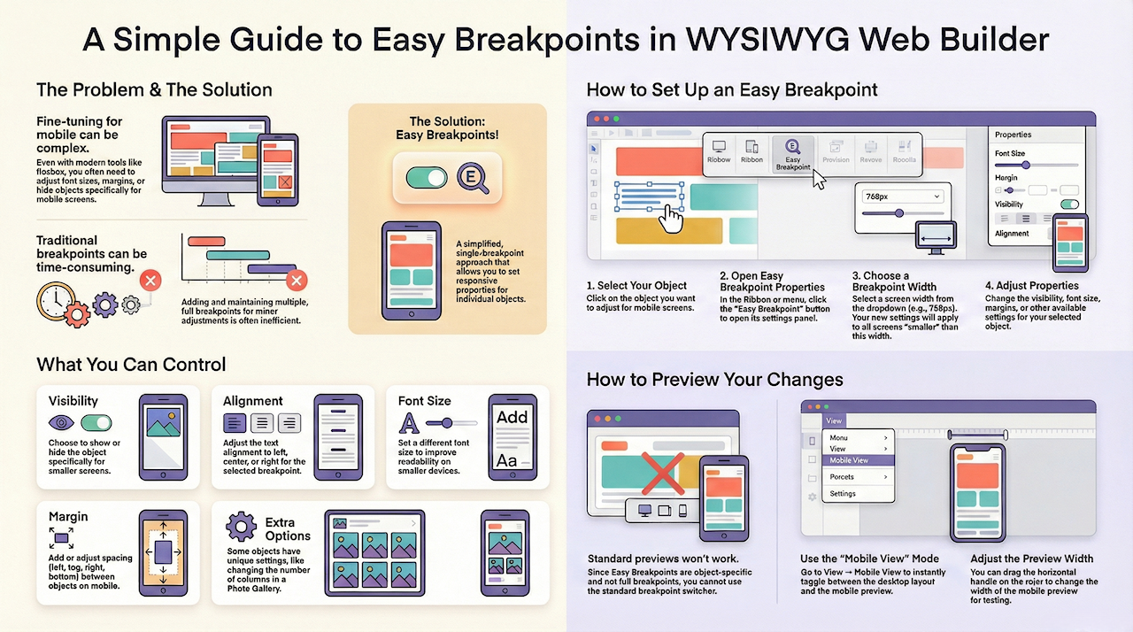 WYSIWYG Web Builder offers many tools to help make your website responsive and mobile-friendly, such as layout grids, flexbox, flex grids, and fixed layouts with breakpoints. Even when using layout grids or flexbox, you may sometimes want to fine-tune the font size, hide or show specific objects, or adjust margins for smaller (mobile) screens. In these cases, adding a breakpoint is necessary.