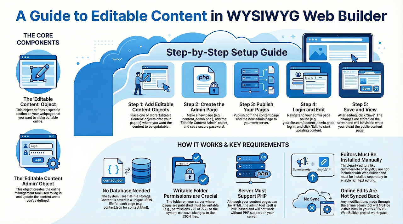 Editable Content can be used to define one or more editable sections on the page. These sections can be modified online with the 'Editable Content Admin' tool. No database setup is required, it uses flat file storage (no MySQL). The page with editable sections does not need to be PHP, because the content is dynamically loaded via javascript/ajax.
