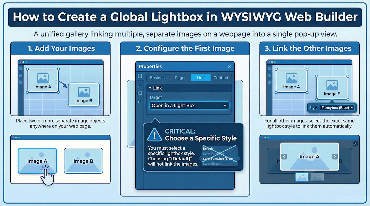 Note that you can download addtional (third party) lightbox add-ons here: https://www.wysiwygwebbuilder.com/free_extras.html