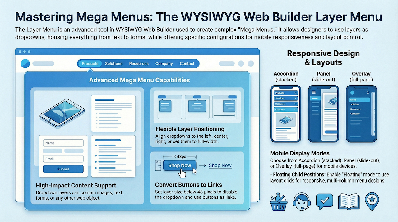 A Layer Menu is an advanced menu where the drop down menus are layers. This is great for creating advanced mega menus with images, text, form or any other object! The drop down layer can be positioned left, centered or at the right of the buttons. It is also possible to make the layer full width of the page. The menu also supports icons (Font Awesome, Material Icons, etc.) and custom images.