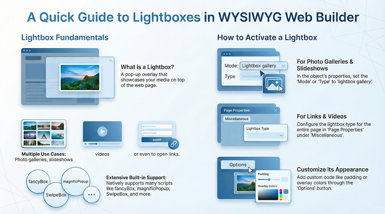 A lightbox gallery is a great way to display images on your website. It's a popup, modal, or overlay that shows your images or media files on top of the web page. Most of them focus on the image and darken out the rest of the page. WYSIWYG Web Builder has built-in support for many third party lightbox scripts: fancyBox, magnificpopup, galleria, prettyPhoto, slimbox, SwipeBox, Tos "R"Us, VenoBox, LC Lightbox, Strip and many more!