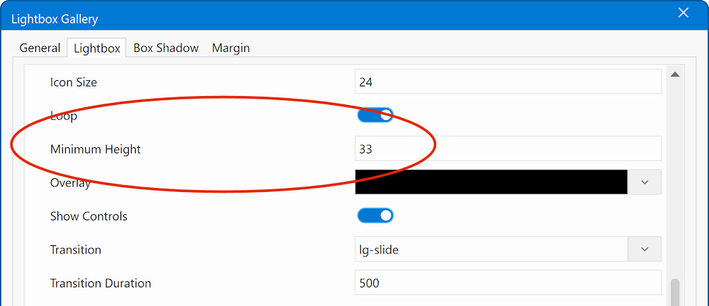 When using the lightbox gallery in Carousel mode, you need to set a minimum height. Without it, the gallery container can collapse to zero height and become invisible.