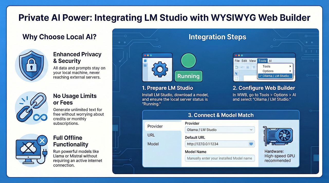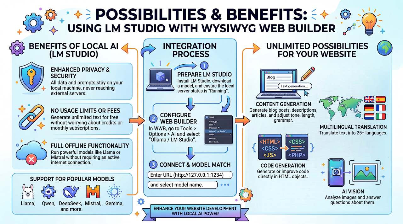 WYSIWYG Web Builder integrates with LM Studio, allowing you to generate, translate and improve text using AI directly on your local computer. Most OpenAI-related text features are compatible with LM Studio.