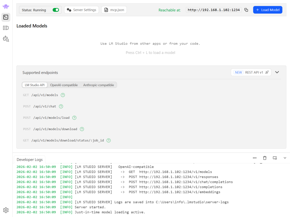 Make sure the LM Studio server status is set to Running. Note the IP address and port number shown, these are required to tell WYSIWYG Web Builder where to connect to the server.