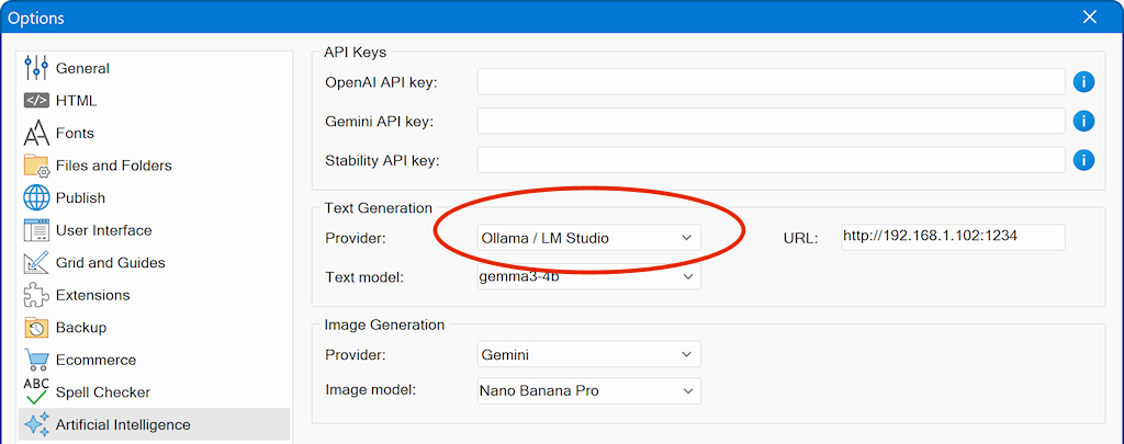 In WYSIWYG Web Builder, navigate to Tools -> Options -> Artificial Intelligence, and select Ollama / LM Studio as the provider for text generation.
