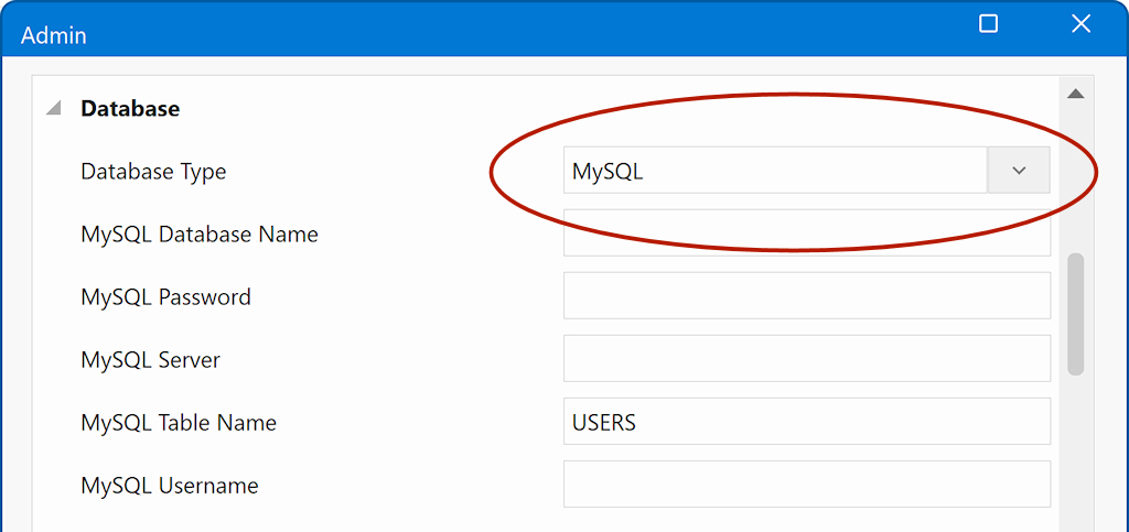 After the table has been created, enter the correct connection settings in the MySQL Database category and verify that the server, database name, username, password, and table name are all correct. Once these settings are configured, the application will use the MySQL database as the user source.