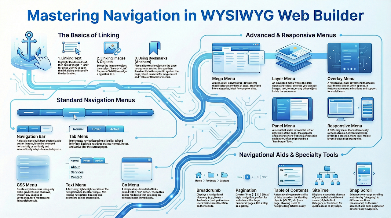 Besides standard link functionality, WYSIWYG Web Builder has many other navigation tools. This article gives a brief overview of the available navigation objects and extensions.