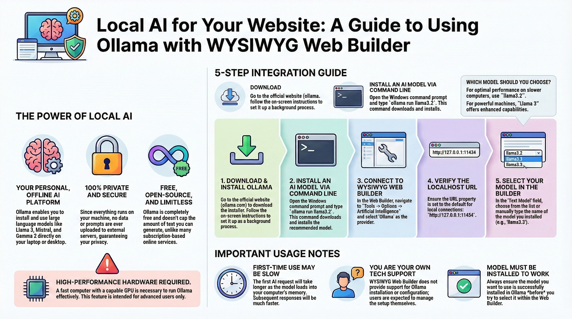 While WYSIWYG Web Builder provides integration with Ollama, we do not offer support for the installation or configuration of Ollama.