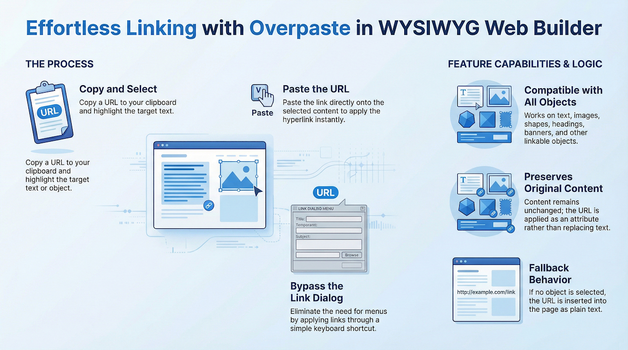 Create clickable links in seconds by simply pasting a URL over selected text or objects. The original content remains unchanged, the link is applied instantly, and theres no need to open the Link dialog.