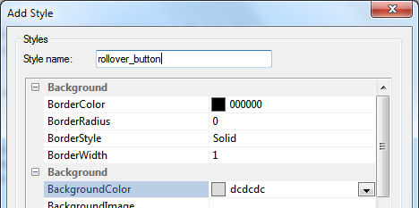 Open the Style Manager and add a new style. Name it 'rollover_button'. Specify the following values: