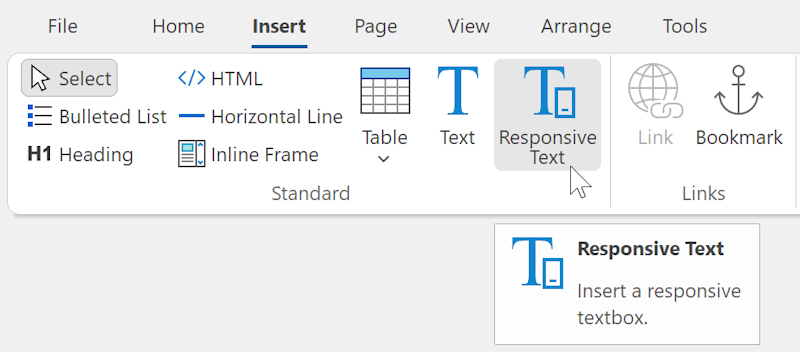 WYSIWYG Web Builder also has a dedicated "Responsive Text" object. This is a simplified text object. It only supports one type of font, color etc. per object. This makes the object easier manageable in complex layout (for example when using style or dark mode). Unlike the standard text object, styles/classes apply to the entire object, not just the selected text. Also, the object produces cleaner HTML output, because it does not use any inline styles.