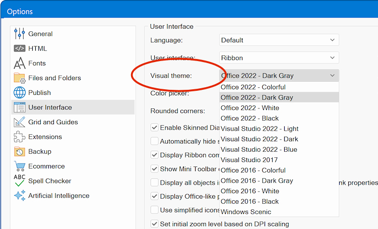 The software also supports several visual themes to change the appearance and colors of the user interface (light/dark/blue etc.)