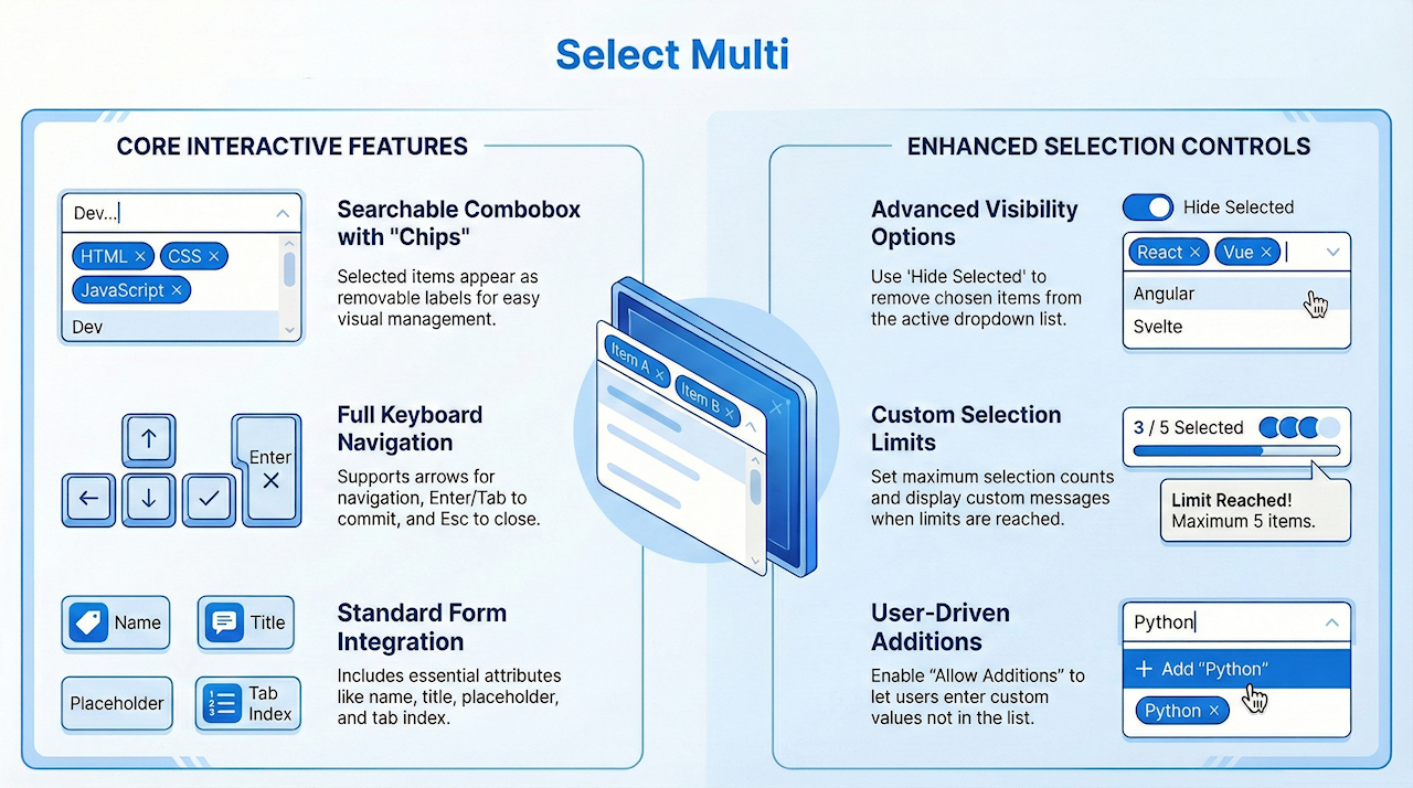 In addition to basic selection features, Select Multi allows you to customize how selected items (“chips”) behave and how the dropdown list responds. These extended options include:
