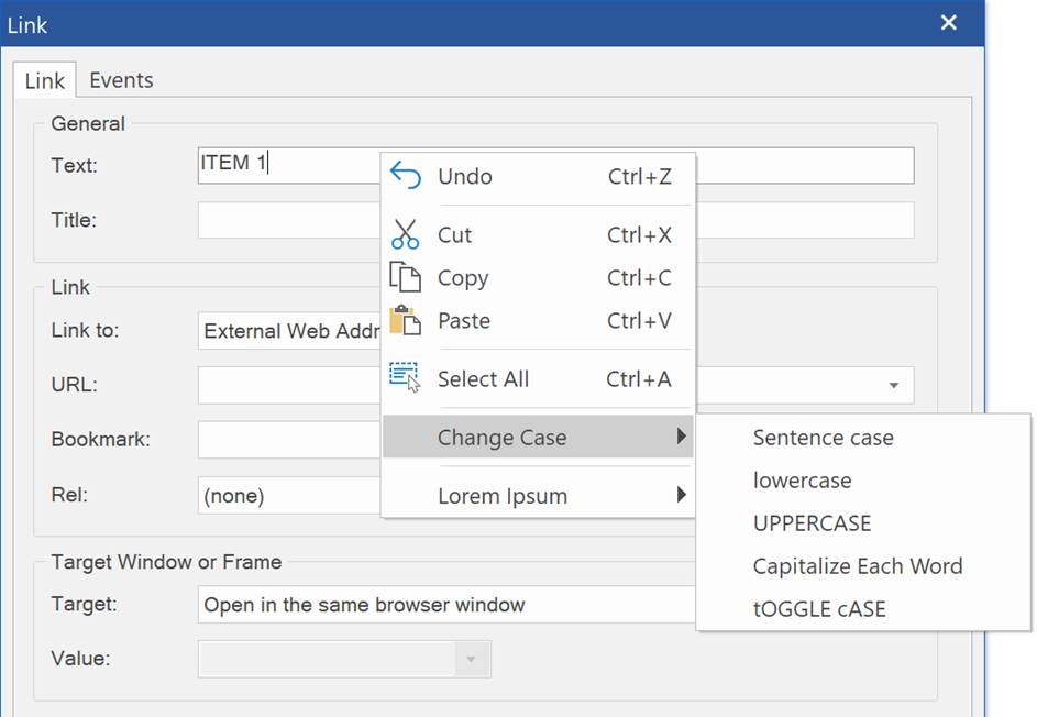 - New feature: Added the ability to add the "aria-label" attribute to make links more accessible to people with disabilities. There is no dedicated property, but you can specify the aria-label text in the 'Title' property by using the ^ split character.