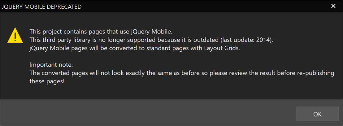 - Removed: jQuery Mobile has been removed from the software. This third-party library is no longer supported because it is outdated (last update: 2014). jQuery Mobile page will be converted to standard pages with Layout Grids.