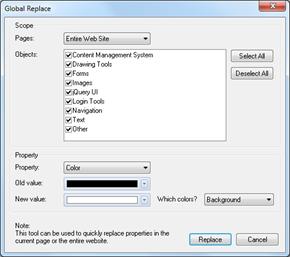 - New feature: Added 'Global Replace' tool. This tool can be used to quickly change the color, font, URL or filename for all objects (or a selection) on the page or entire website.