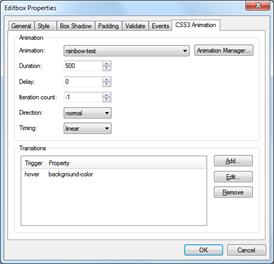 - New feature: Added CSS3 animation and transition support! The new Animation Manager can be used to define animations (with key frames) and WYSIWYG Web Builder already includes more than 50 predefined animations to get you started!