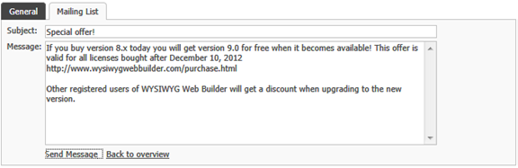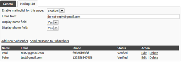 Collect and manage email addresses in a mailing list. Users can subscribe to the mailing list by submitting their email address in the standard form. A confirmation email is sent to verify the email address. The admin can send messages to the subscribed users.