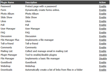 The plug-in manager can be used to enable/disable CMS plug-ins online.