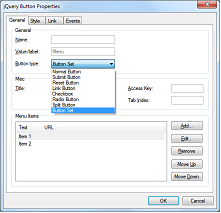 'Split button' mode to jQuery Button. Adds a drop down menu to the button.